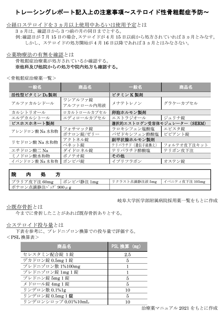 トレーシングレポート(服薬情報提供書) 保険薬局で得られた処方に関する情報を、院内の薬剤師を通じて処方医へお伝えさせて頂きます。 ① 服薬情報提供書 PDF版 Word版 ② 服薬情報提供書(がん化学療法) PDF版 Excel版 ③ 吸入指導実施報告書 PDF版 Word版 ④ 疼痛状態に関する服薬情報提供書 PDF版 Excel版 ⑤ ステロイド性骨粗鬆症(GIO)予防についての服薬情報提供書 PDF版 Word版 ⑥服薬情報提供書(T細胞療法) PDF版 Excel版 参考ツール ① がん化学療法有害事象フローチャート PDF版 ② オピオイド換算表 PDF版 ③ トレーシングレポート記入上の注意事項~ステロイド性骨粗鬆症予防~ PDF版 Word版 ④T細胞療法の有害事象モニタリング PDF版 FAX058-230-7084 (岐阜大学病院・薬剤部)