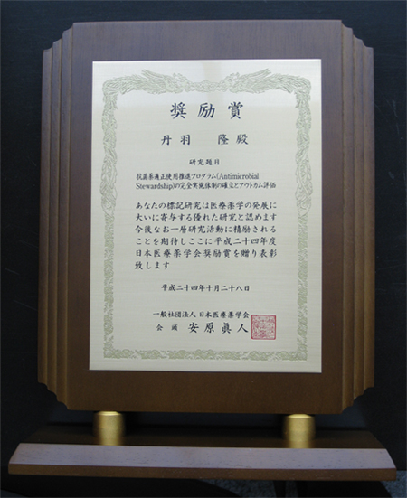 平成24年10月27〜28日、第22回日本医療薬学会年会(新潟開催)において、丹羽隆薬剤師が『奨励賞』を受賞しました。今回の受賞の研究テーマは